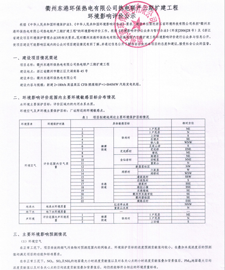 衢州東港環(huán)保熱電有限公司熱電聯(lián)產(chǎn)三期擴建工程環(huán)境影響評價公示
